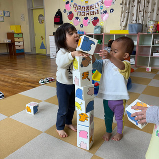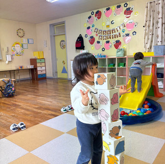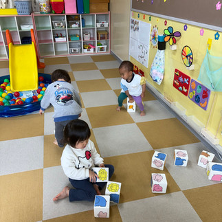 入園して1週間ちょっとがたちましたね。初めての園生活でどんなふうにすごしているのかなぁ?とお家の方も不安だと思いますが、笑顔で送って来て頂きありがとうございます。お子さんたちも不安ながらも、お部屋で過ごす流れが分かり、身支度も自分たちで頑張る姿がとても可愛らしいです。お部屋では元気いっぱい遊んでくれています。部屋の滑り台からボールプールにダイナミックに滑り大声で笑う様子や粘土遊びでは型抜きで、形を作り楽しんでいます。お話も自分からしてくれるようになってきているんですよ!暖かくなったらお外遊びも沢山していきたいと思います。